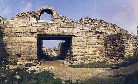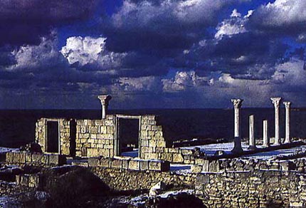 Ruins, located in the western part of Sevastopol on the Heraclian Peninsula. An important political and cultural centre of the Black Sea region. Founded by Greeks in 422-421 B.C. From 5-1 B.C. was a city-state with democratic self-government. In 3-2 B.C. the first defence structures consisting of 24 towers, 10-15 m high, were built. More than 30 streets and a large number of gardens were laid in the city. The city centre contains an acropolis and an agora (place of public meetings), a theatre, and a temple. During the 1st-4th c. Chersonese became an aristocratic republic under the control of Rome. Later it fell under Byzantine rule and in the 4th c. converted to Christianity. In the 5th-6th c. a mighty defence system was constructed. In 988 prince Volodymyr the Great captured Chersonese. In 1299 it was captured and destroyed by the Tatar-Mongols.